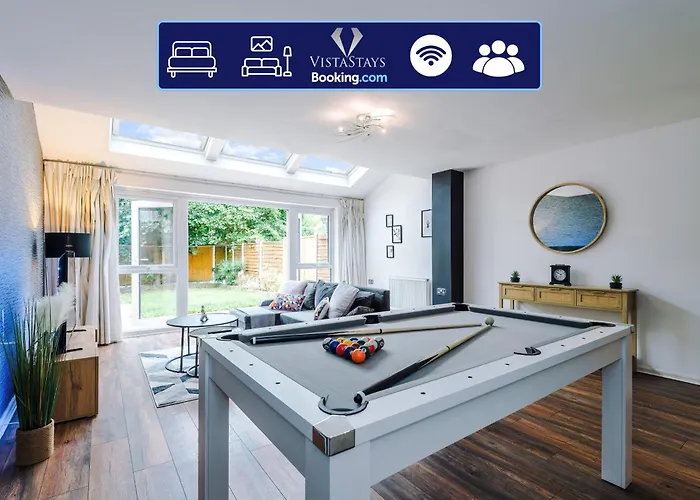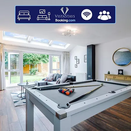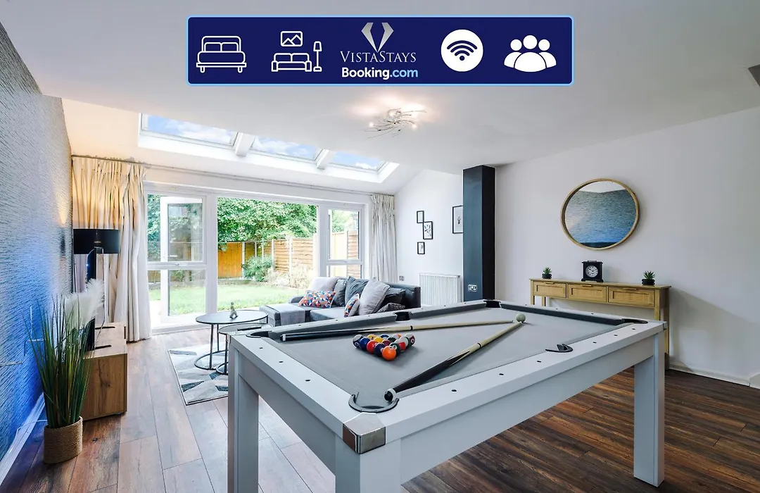 Spacious 3Bdr House By Vista Stays Short Lets & Serviced Accommodation Salford With Pool Table & Free Parking includes a fully equipped kitchen, as well as views over the garden.